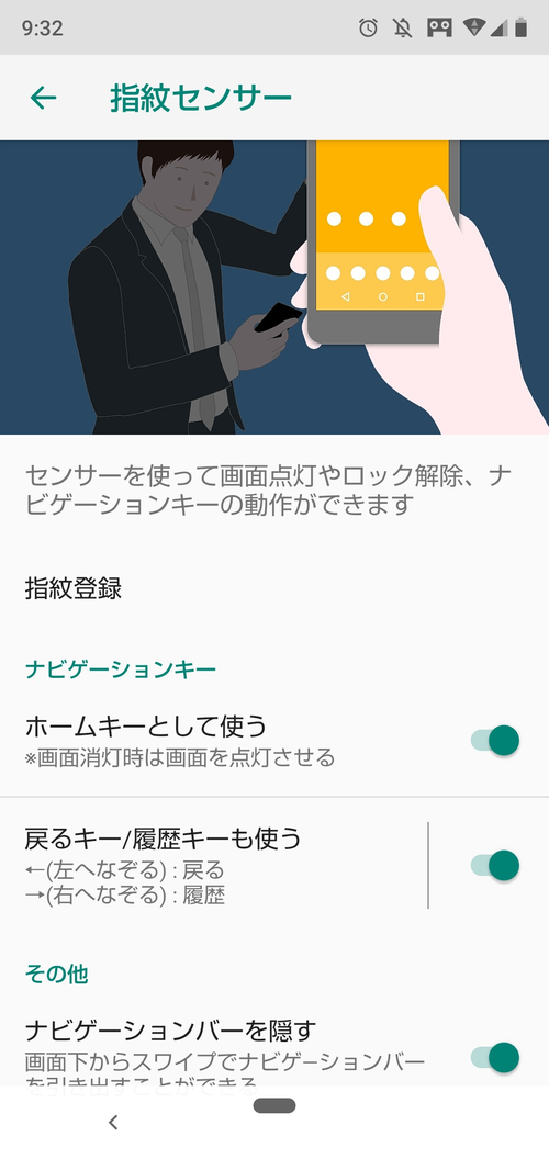 Android 9 PieになってからAndroidも最新iOS同様にホームボタンやタスクボタンが廃止(バックボタンのみ残留)され、かわりにナビゲーションバーで操作するのですが、操作に慣れていないとパニックになります。そこでAQUOS R2 Compact SH-M09の指紋センサーの出番です。AQUOS便利機能の中にある[指紋センサー]の[ナビゲーションバー]の項目を両方オンにすると指紋センサーをホームキーや戻る/履歴ボタンとし活用することができます。
