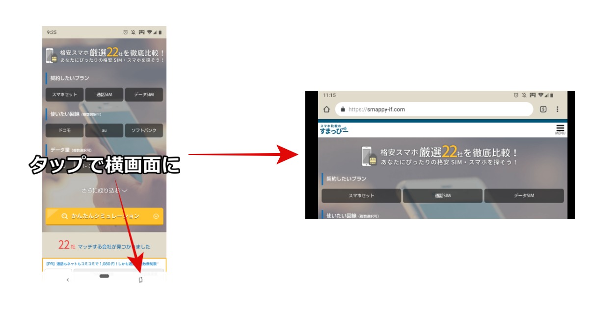 これにはおどろきました。なんと自動回転をオフにした状態でスマホを横にするとこれまでタスクボタン(履歴ボタン)だったところに横画面表示のボタンが出現するのです。なので、普段から自動回転をオフにしていても、ちょっと横にしたいときはそのボタンを押すことで横画面になります。戻したいときも同じ手順で行います。