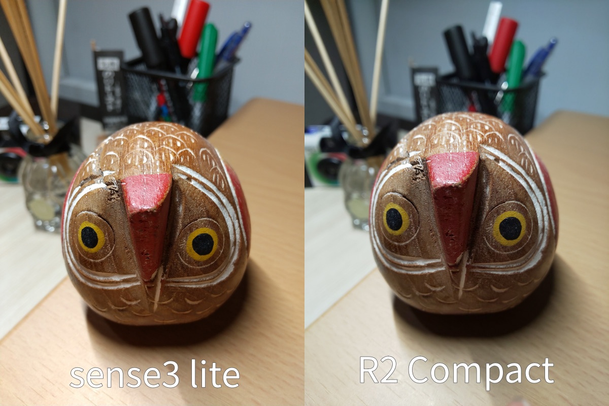 屋内で撮影しました。解像度そのものはどちらもそれほど差はありませんが、赤の色合いはsense3 liteのほうが鮮やかに写っています。机の色もよりリアルに近い色合いでSIMフリー版AQUOSシリーズではかなりレベルを上げてきたなと思います。通常モードですが背景もしっかりボケています。