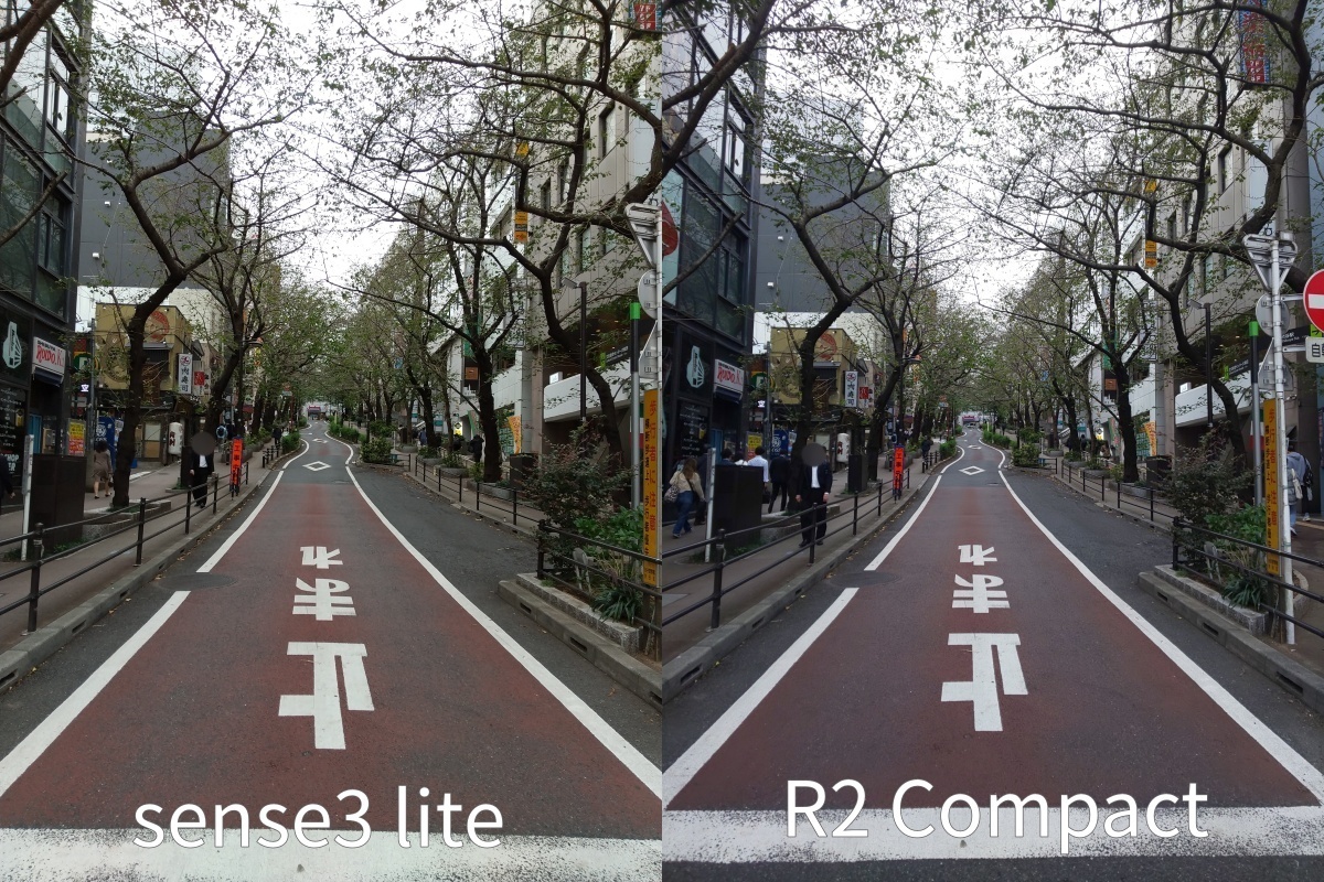 夜のビルの写真はかなり明るく写っていますが、ビルに明るさを合わせているため、下にある駅の光が白飛びしてしまっています。この写真を見るとわかりますが、sense3 liteは赤っぽく、R2 Compactは青っぽい色合いに偏っていますね。