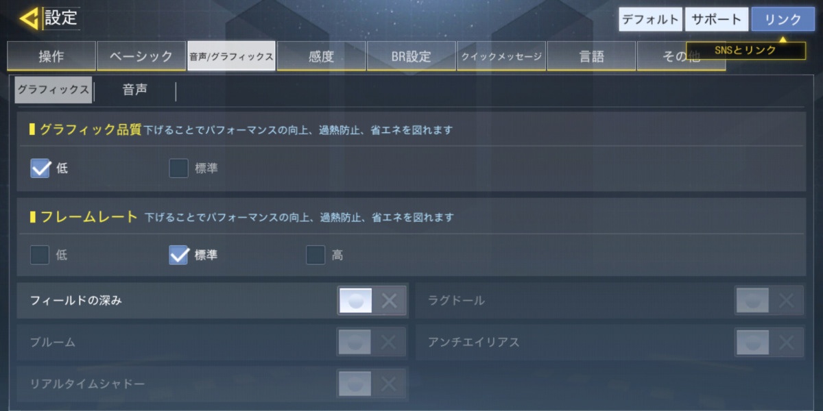 初期設定では「グラフィック:低」、「フレームレート:標準」に設定されていて、グラフィックは「高」と「最高」が選べず、フレームレートは「最高」を選ぶことができません。
