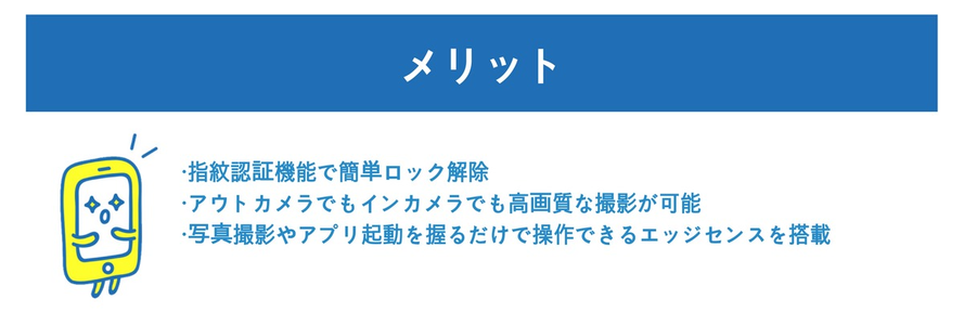 スマートフォンの両端を握って操作する機能エッジ・センスを搭載しています。スリープ状態から握るだけでカメラを起動したり、握るだけで写真撮影ができます。
