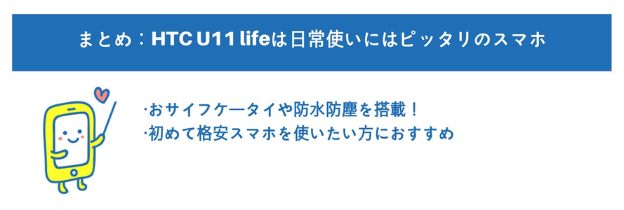HTC U11 lifeはおサイフケータイや防水防塵、ハイレゾ対応など日常で使う機能がほとんど入っている万能な格安スマホです。