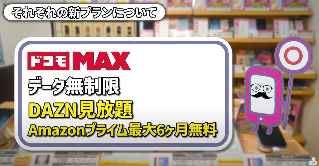 - ドコモマックス:データ無制限+DAZN+Amazonプライム