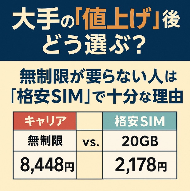 2025年は、ドコモとKDDI(au)が料金プランを値上げ、ソフトバンクは事務手数料を大幅改定と、携帯料金を取り巻く前提が変わりました。取材の肌感でも「このまま大手の無制限でいいの?」という声が急増。結論から言うと、月に30GBも使わない人の多くは、格安SIM(サブブランド含む)で十分です。この記事では、最新の値上げ内容と事務手数料の変更をおさえつつ、「無制限じゃない選び方」を具体的な料金実例で解説します。