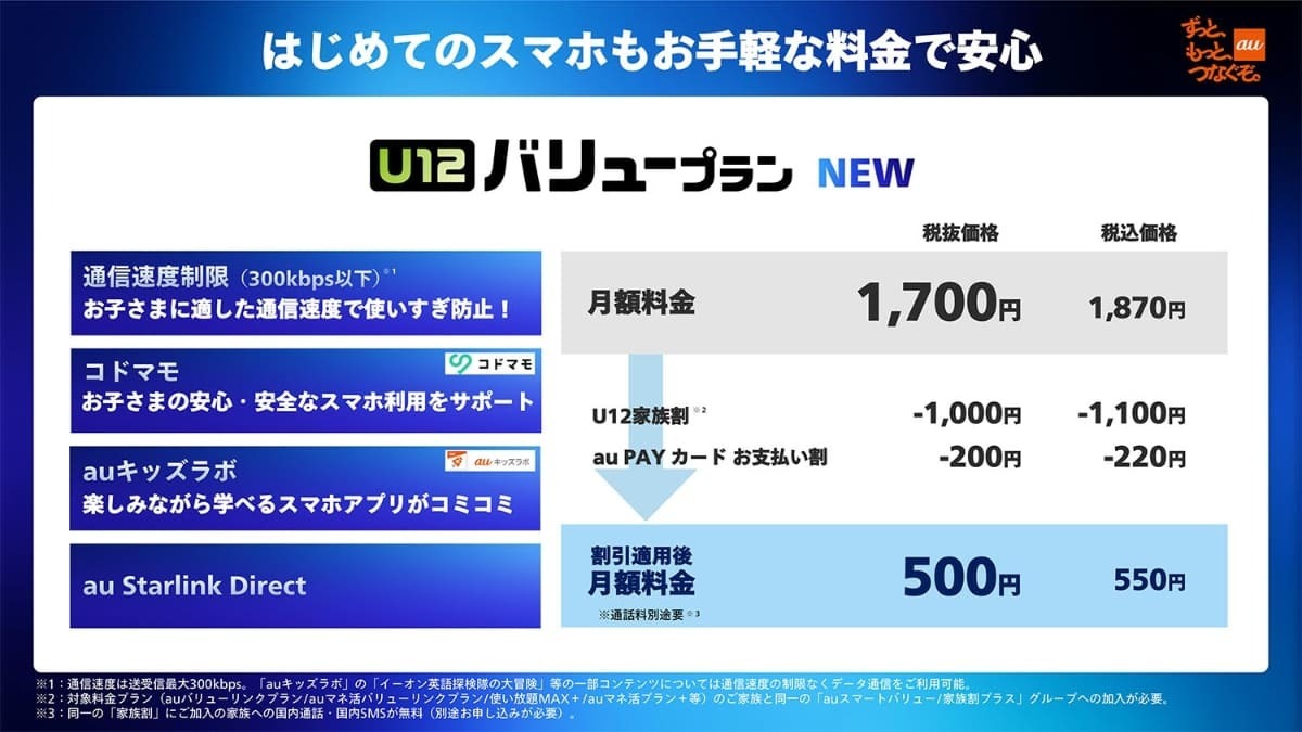 | 項目 | U12バリュープラン(au) | U16バリュープラン(au) | シニアバリュープラン(au) |