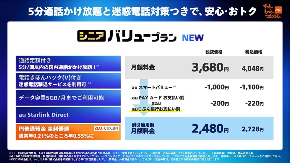 | シニアバリュープラン(au) | 5GB+5分かけ放題 | 2,728円〜 | 60歳以上向け。通話・迷惑電話対策・銀行金利優遇あり |