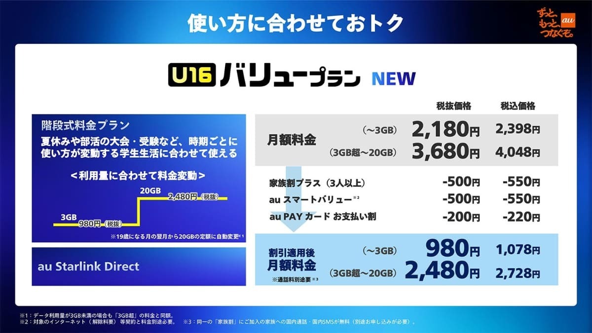 | U16バリュープラン(au) | ~3GB/~20GB(段階制) | 1,078円〜2,728円 | 中高生向け。柔軟な料金制+サブスク特典+衛星通信対応 |