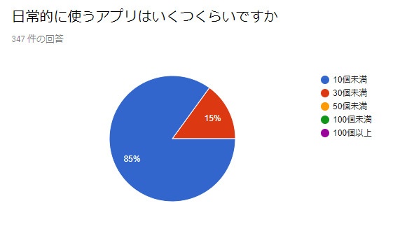 次に「日常的に使うアプリ」は何個くらいか聞いてみたところ、85%の方が10個未満と、厳選して利用していることが分かりました。