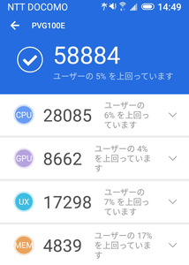 トータルスコア58884!うーん、低い!CPUの性能はAQUOS sense2とそれほどかわりませんが、GPU性能が1万をきっているので、3Dゲームは難しそうです。