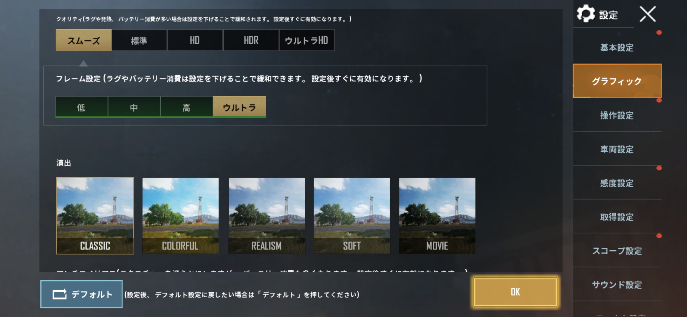 ※ハイスペック端末ではウルトラの横に極限という最高設定が表示されます。