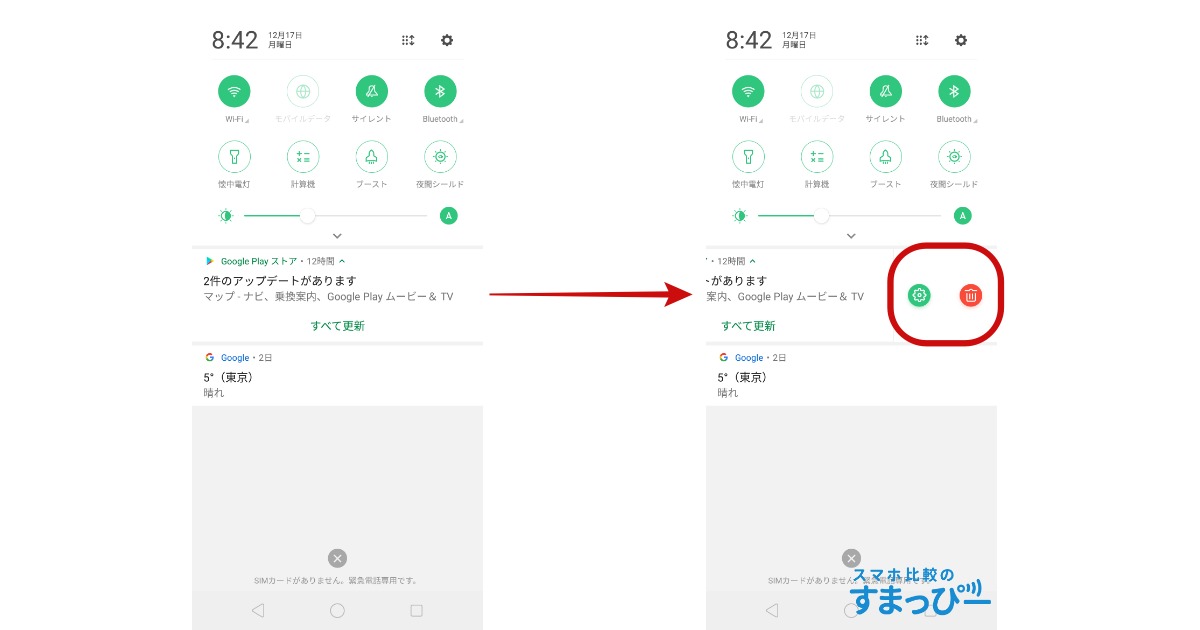 OPPO R17 Neoの通知を消す際に、一括削除であれば問題ありませんが一つずつ消す際は1度スワイプしてさらに「ごみ箱マーク」タップする必要があります。