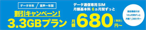 | データ半年・音声一年間割引キャンペーン | データ専用SIM(SMSあり/なし)が6ヶ月、通話機能付きSIMが12ヶ月割引! | 2018/8/1〜2019/1/31 | ★★★★★ |